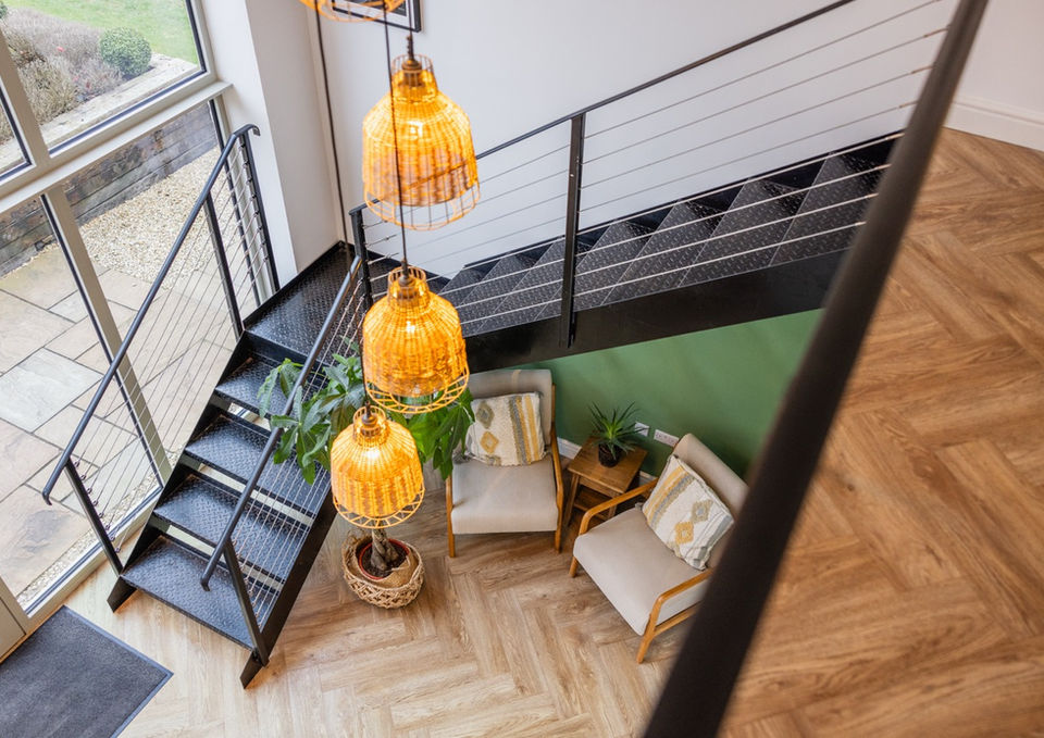 Despite its traditional form, Bromley Barn is unique within the Studios as it is our only brand new building. The original open-fronted Dutch barn has been replaced with an exquisite gabled Cotswold stone building, with two lean-to’s and a beautiful Welsh slate roof. As a SIPS building, its sustainable credentials are impressive – purely relying on sun light and electric radiators to heat each unit. The building was designed as four autonomous units, each having access to a central quad + staircase which has WC’s and a lobby. Bromley offers approximately 4,000 sq. ft of internal space.